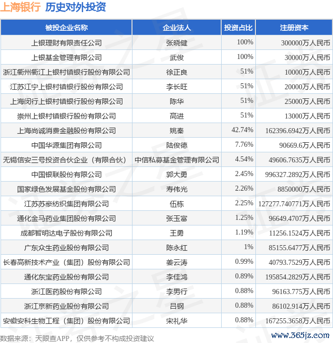 本站音问,凭证天眼查APP浮现,上海银行(601229.SH)新增沿途对外投资事件,被投资公司为甘李药业股份有限公司,法定代表东谈主陈伟,投资占比为0.57%。该公司从事医药制造业,注册成本为60106.529万东谈主民币。当今,上海银行共存在对外投资39项,投资占比前20的神气见下表: