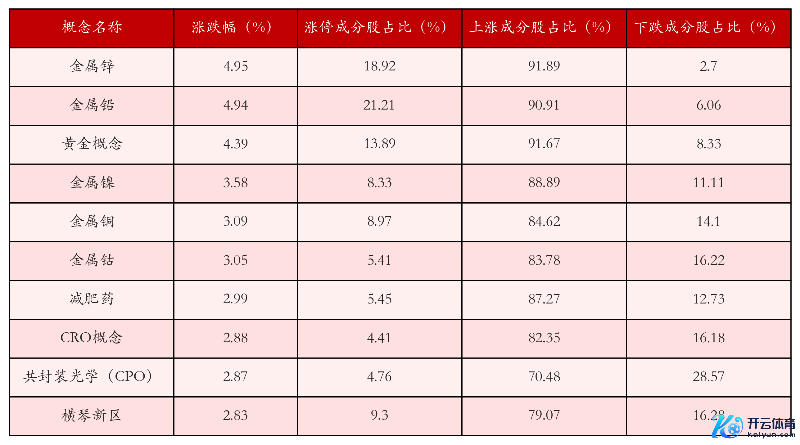 把柄A股成见涨跌幅与所对应的股票池详细分析kaiyun网址,涨幅靠前的三个成见板块永诀为:金属锌、金属铅与黄金成见。排行前10位的成见板块联总计据见下表: