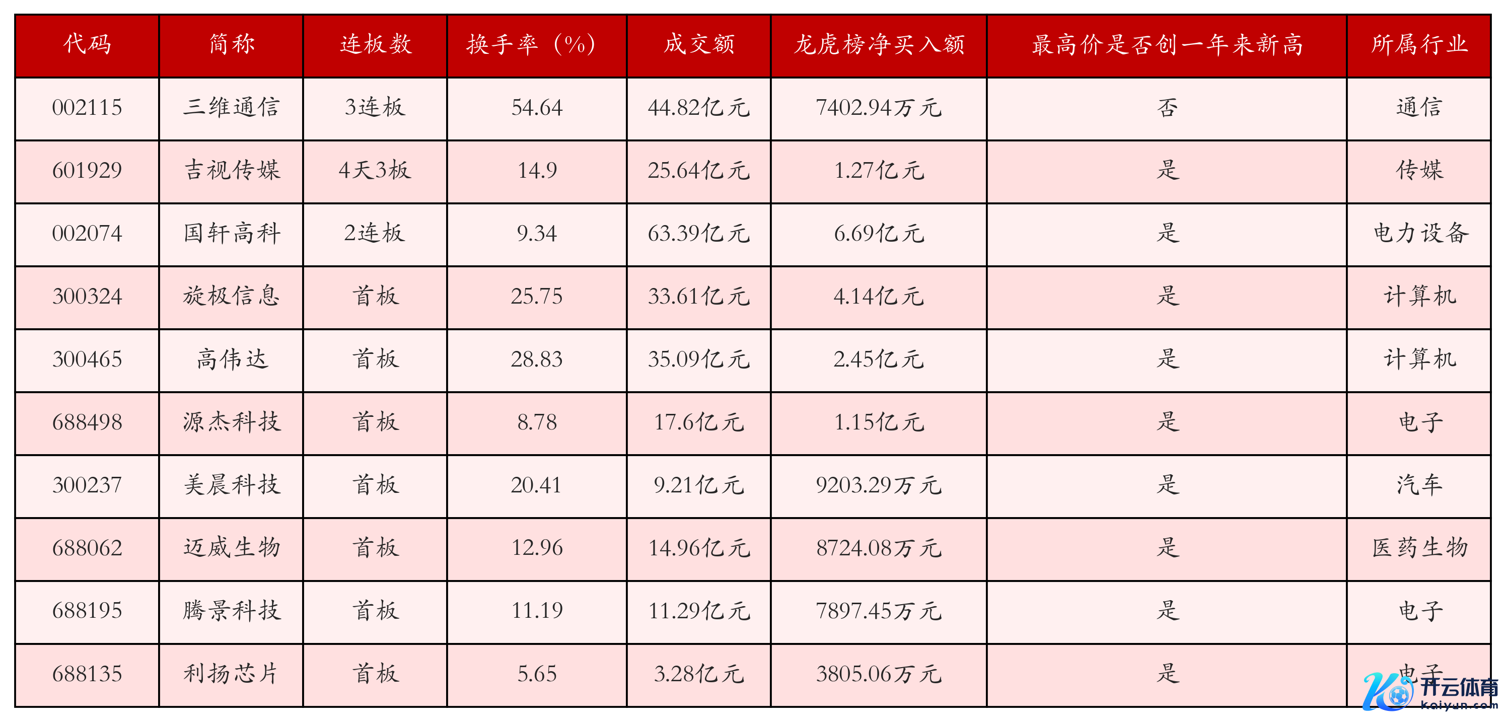 为止9月1日收盘,上证综指上升0.46%,收于3875.53点,深证成指上升1.05%,收于12828.95点,创业板指上升2.29%,收于2956.37点。本日沪深两市A股以为121只涨停,详细现时连板数以及当日龙虎榜数据,其中较为强势的前三只个股永诀为:三维通讯(002115)、吉视传媒(601929)与国轩高科(002074)。本日强势个股前10位具体数据见下表: